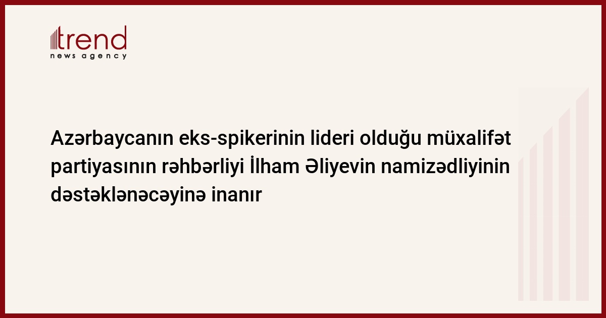 Azərbaycan, Bakı, 07 oktyabr / Trend , müxbir A.Hüseynbala / Azərbaycanın eks-spikerinin lideri olduğu müxalif Cəmiyyət Partiyasının (ACP) rəhbərliyi hakim partiyanın namizədi, indiki dövlət başçısı İlham Əliyevin prezidentliyə namizədliyinin dəstəklənəcəyinə inanır.