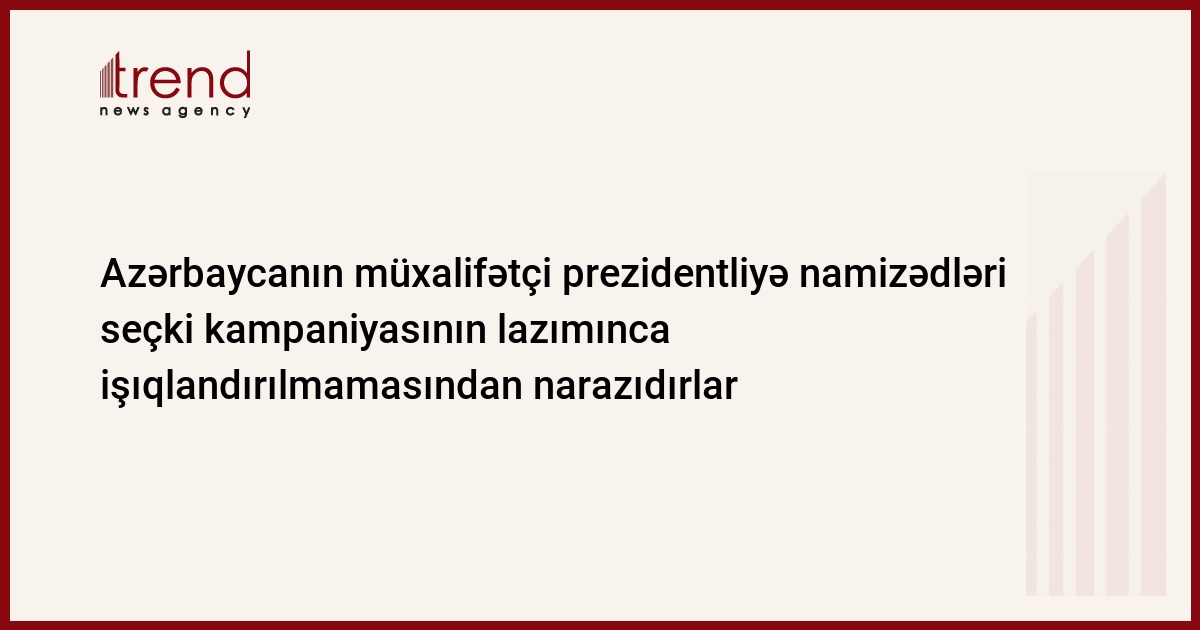 Azərbaycan, Bakı, 09 oktyabr / Trend , müxbir İ.Əlizadə/ Azərbaycanda prezidentliyə namizədlər mətbuatın, xüsusən də televiziyaların seçki kampaniyasını lazımınca işıqlandırmamasından narazıdırlar.