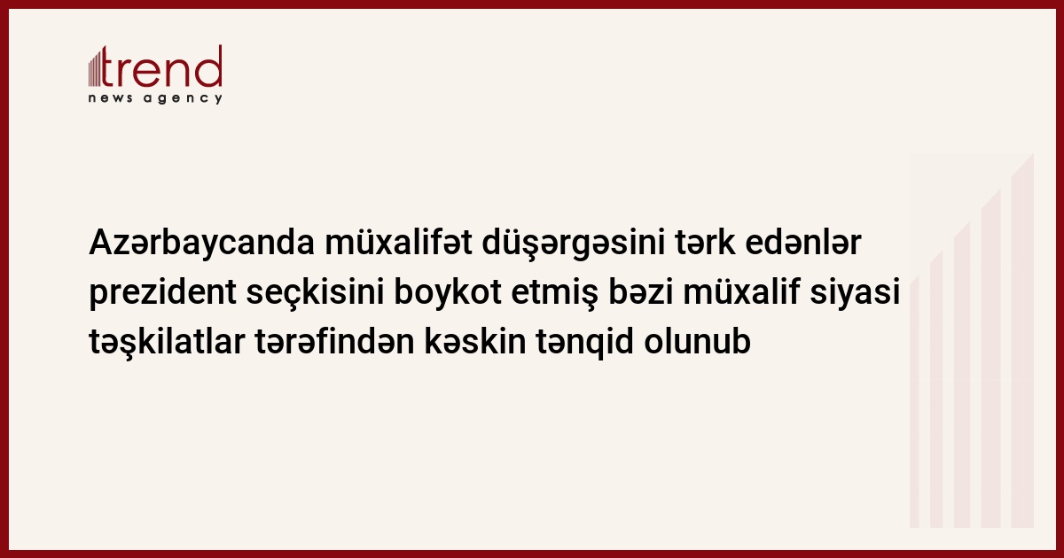 Trend -un arayışı: Azərbaycanda prezident seçkisi oktyabrın 15 - də keçiriləcək. Sentyabrın əvvəlində їAzadlıqї blokuna daxil olan partiyalar ї Xalq Cəbhəsi, Liberal Partiya, Vətəndaş və İnkişaf partiyaları, Müsavat partiyası və їAzərbaycan Naminəї İctimai Forum prezident seçkisini qanunsuz tanımaq barədə birgə bəyanat imzalayıblar. Bəyanatda prezident seçkisindən sonra formalaşacaq hakimiyyət qeyri - legitim elan edilib.