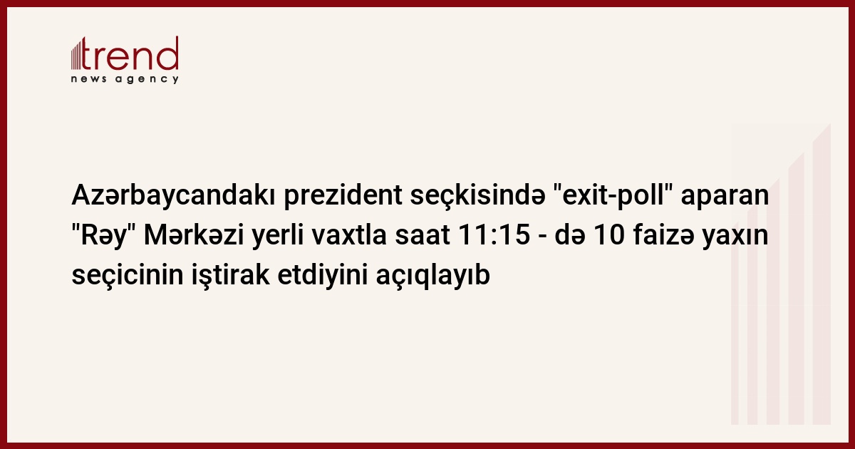 Azərbaycan, Bakı, 15 oktyabr / Trend , müxbir S.Kazımlı/ Bu gün Azərbaycanda keçirilən prezident seçkisində müşahidə və "exit-poll" həyata keçirən "Rəy" məlumatına əsasən, Biləsuvar, Ağdam və Goranboy rayonlarında seçicilərin fəallığı müşahidə olunur. Bu barədə Trend - a "Rəy" təşkilatından məlumat verilib.