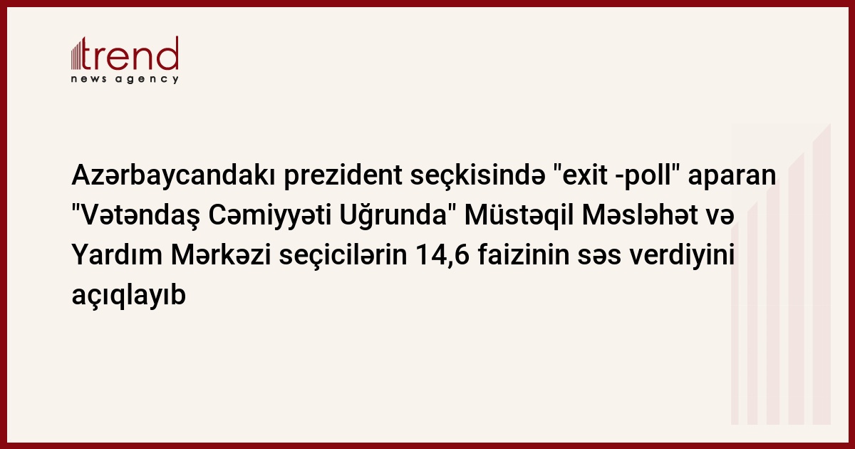 Azərbaycan, Bakı, 15 oktyabr / Trend , müxbir Ş. Cavadsoy/ Azərbaycanda prezident seçkisindəki "exit - poll" aparan "Vətəndaş Cəmiyyəti Uğrunda" Müstəqil Məsləhət və Yardım Mərkəzinin saat 10:00 - a olan məlumatına görə, seçicilərin fəallığı 14,6 faizdir.