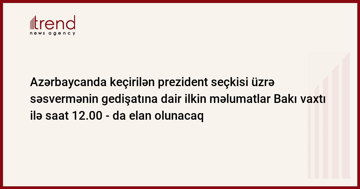 Azərbaycan, Bakı, 15 oktyabr/ Trend , müxbir C.Babayeva/ Azərbaycanda keçirilən prezident seçkisi üzrə səsvermənin gedişatına dair ilkin məlumatlar yerli vaxtla saat 12.00 - da elan olunacaq.