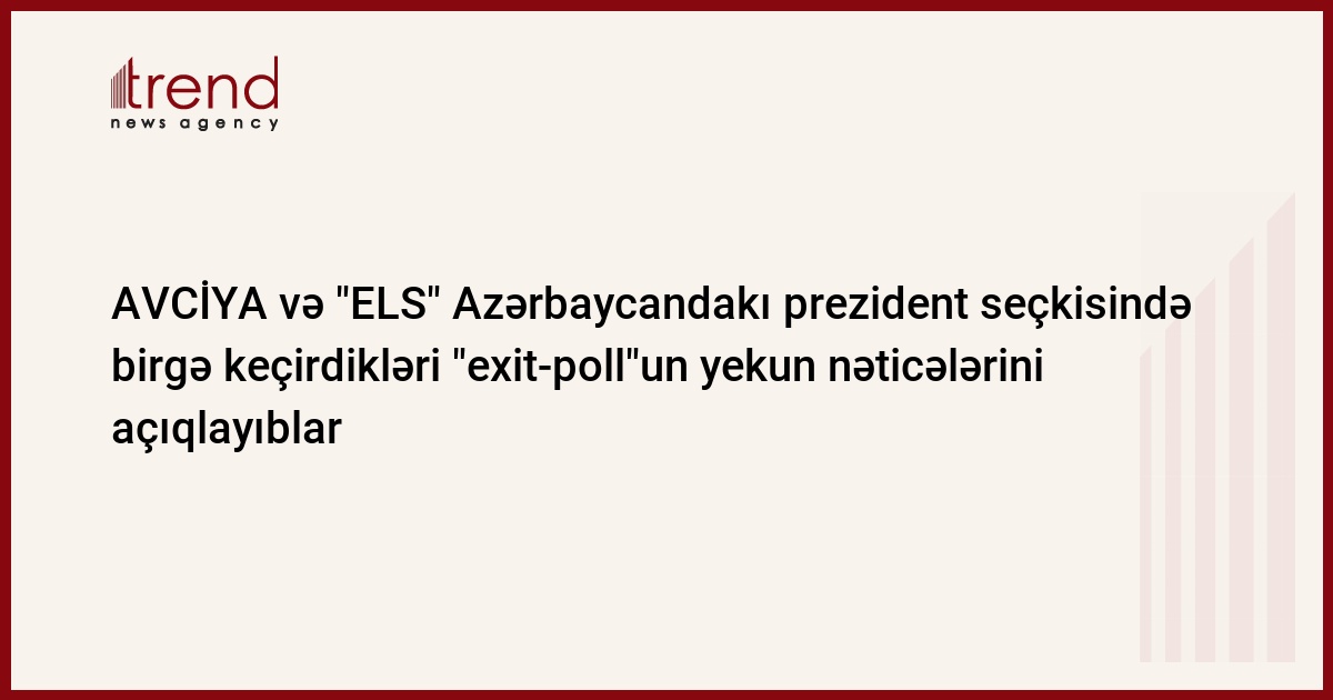 Azərbaycan, Bakı, 16 oktyabr/ Trend , müxbir İ.Əlizadə/ Azərbaycanda Vətəndaş Cəmiyyətinin İnkişafına Yardım Asossiasiyası (AVCİYA) və "ELS" Müstəqil Araşdırmalar Mərkəzi prezident seçkisində birgə keçirdikləri "exit-poll"un yekun nəticələrini açıqlayıblar.