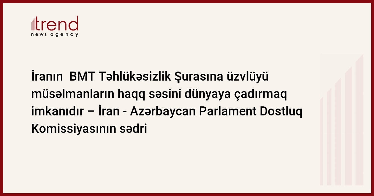 İran parlamentinin nümayəndəsi və İran - Azərbaycan Parlament Dostluq Komissiyasının sədri Musəvi Trend - a bildirib ki, BMT TŞ - yə üzv olmaq təkcə İranın deyil, bütün müsəlman ölkələrinin, o cümlədən Azərbaycanın da haqqıdır.