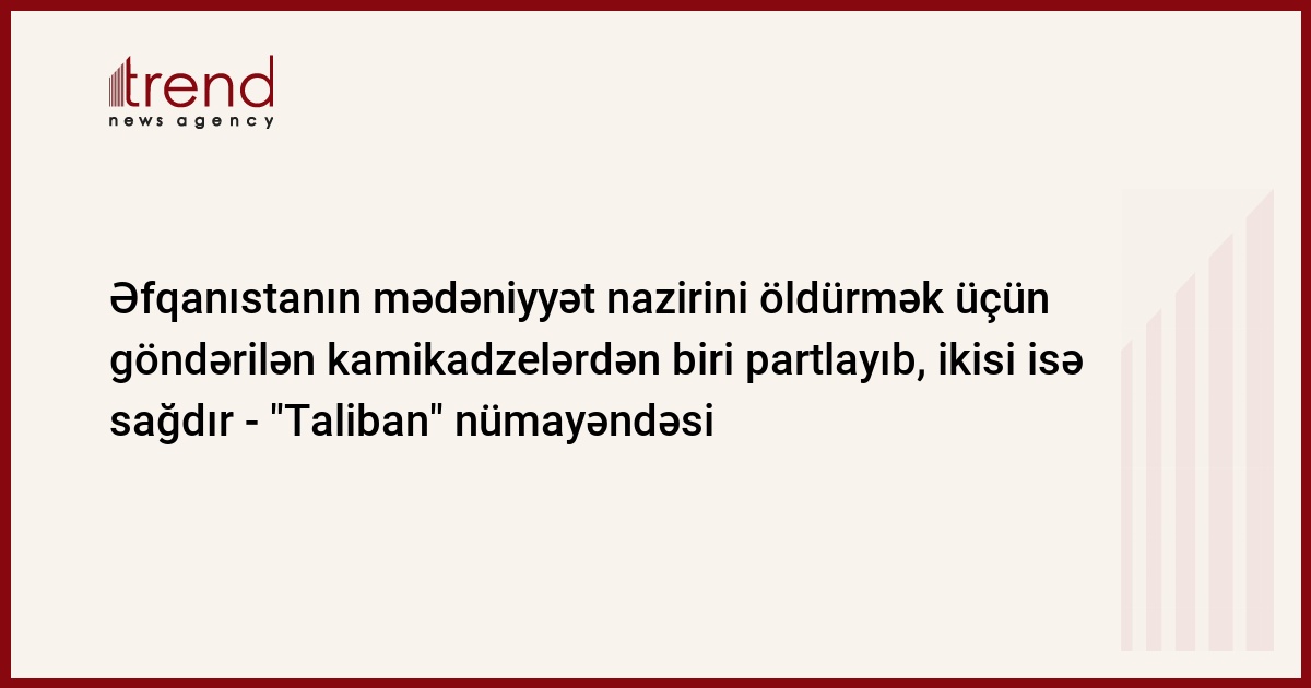 Əfqanıstan, Kabil, 30 oktyabr/ Trend , müxbir A.Hakimi/ "Taliban" nümayəndəsi İzzətula Mucahidin Trend -un Kabildəki müxbirinə verdiyi məlumata görə, Əfqanıstanın Mədəniyyət və İnformasiya Nazirliyinə naziri öldürmək məqsədi ilə üç kamikadze göndərilib. Onlardan biri özünü partladıb, ikisi isə sağdır.