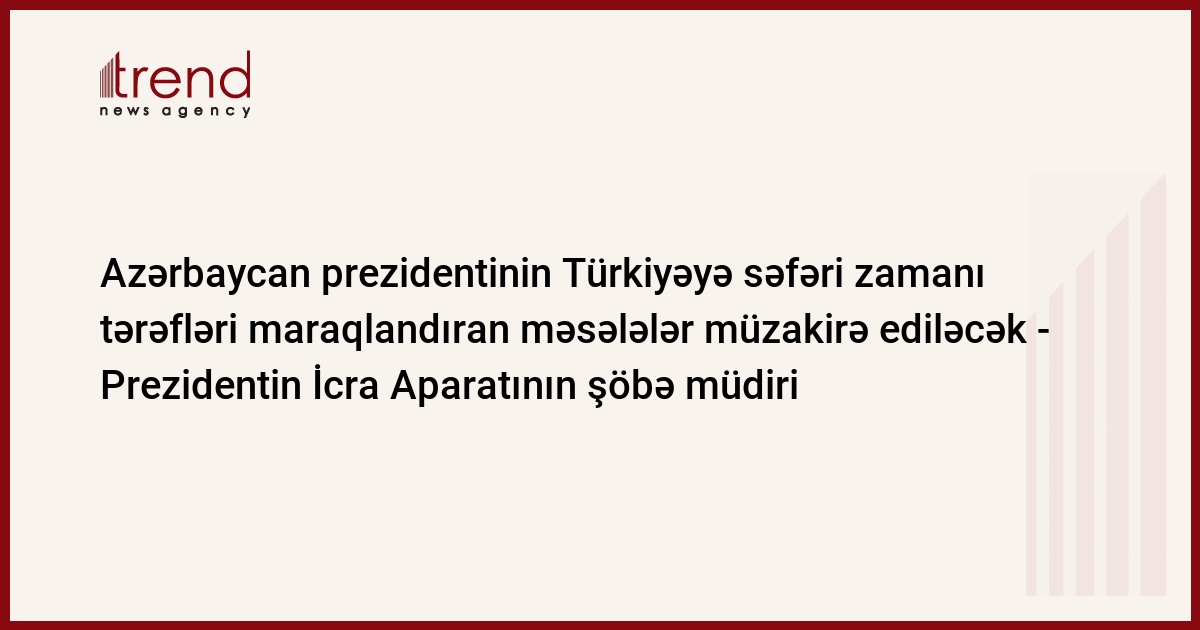 "Səfər zamanı hər hansı bir sənədin imzalanıb - imzalanmamasından asılı olmayaraq, tərəfləri maraqlarıdan bütün məsələlər müzakirə olunacaq", - bazar ertəsi Trend - a Prezidentin İcra Aparatı beynəlxalq əlaqələr şöbəsinin müdiri Novruz Məmmədov bildirib.