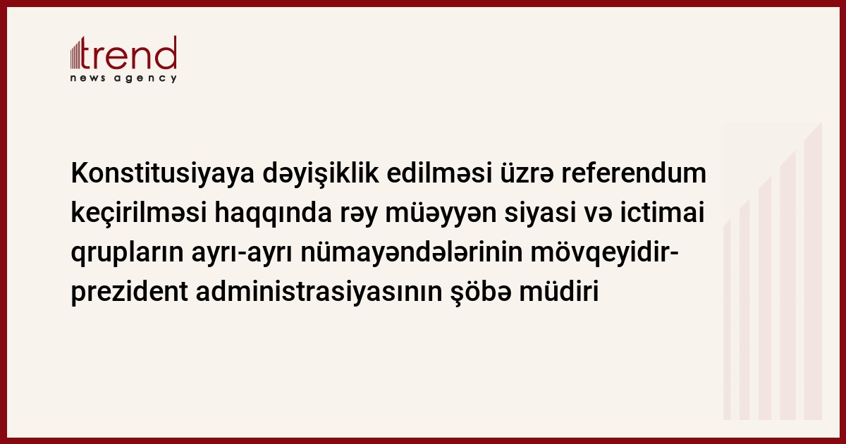"Konstitusiyaya dəyişikliklərin edilməsi üzrə referendumun keçirilməsi haqqında qərar isə - bu, müəyyən siyasi və ictimai qrupların ayrı-ayrı nümayəndələrinin dövlətin inkişaf perspektivlərinə baxışını əks etdirir", - Azərbaycan Prezidenti İcra Aparatının şöbə müdiri bildirib.