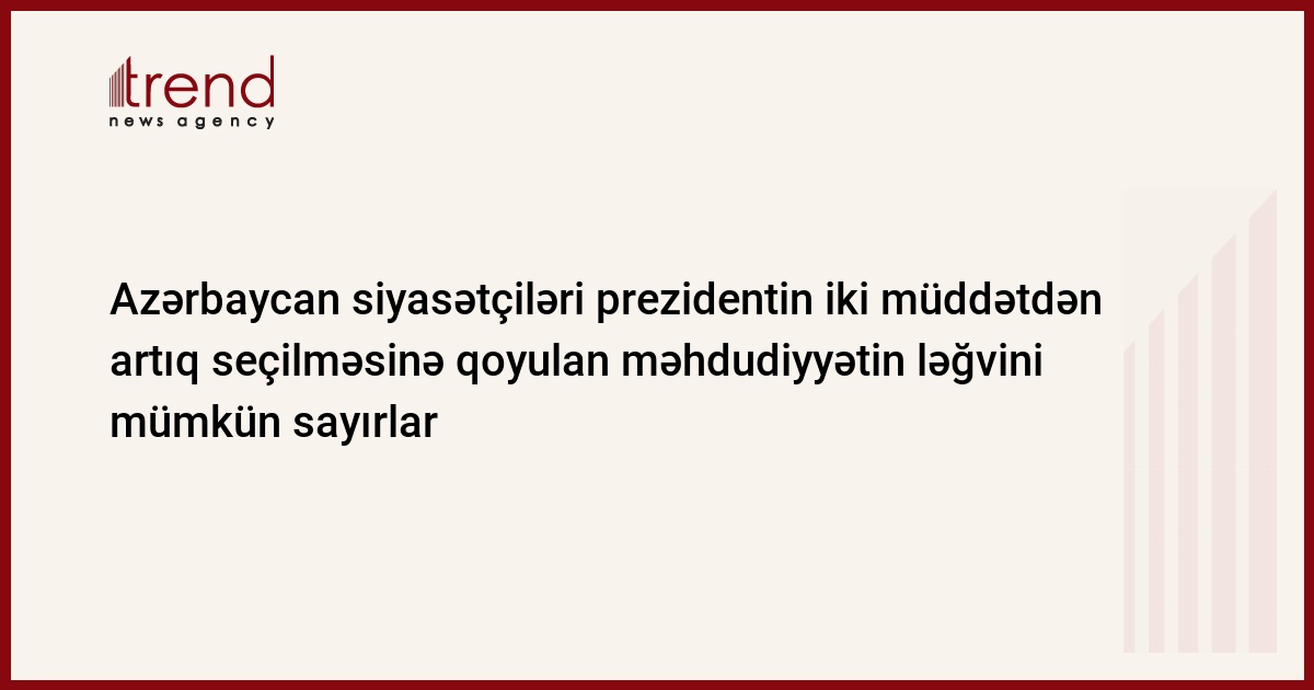 Trend - un arayışı: Azərbaycan Konstitusiyasının 101-ci maddəsinin 5-ci bəndinə əsasən, heç kəs iki dəfədən artıq təkrarən prezident seçilə bilməz. Prezidentin səlahiyyət müddəti beş ildir.