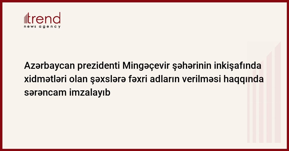 Azərbaycan, Bakı 10 noyabr / Trend / Azərbaycan prezidenti İlham Əliyev Mingəçevir şəhərinin 60 illik yubileyi münasibətilə şəhərin sosial-iqtisadi inkişafında xidmətləri olan şəxslərə Azərbaycan Respublikasının fəxri adları verilməsi haqqında sərəncam imzalayıb.