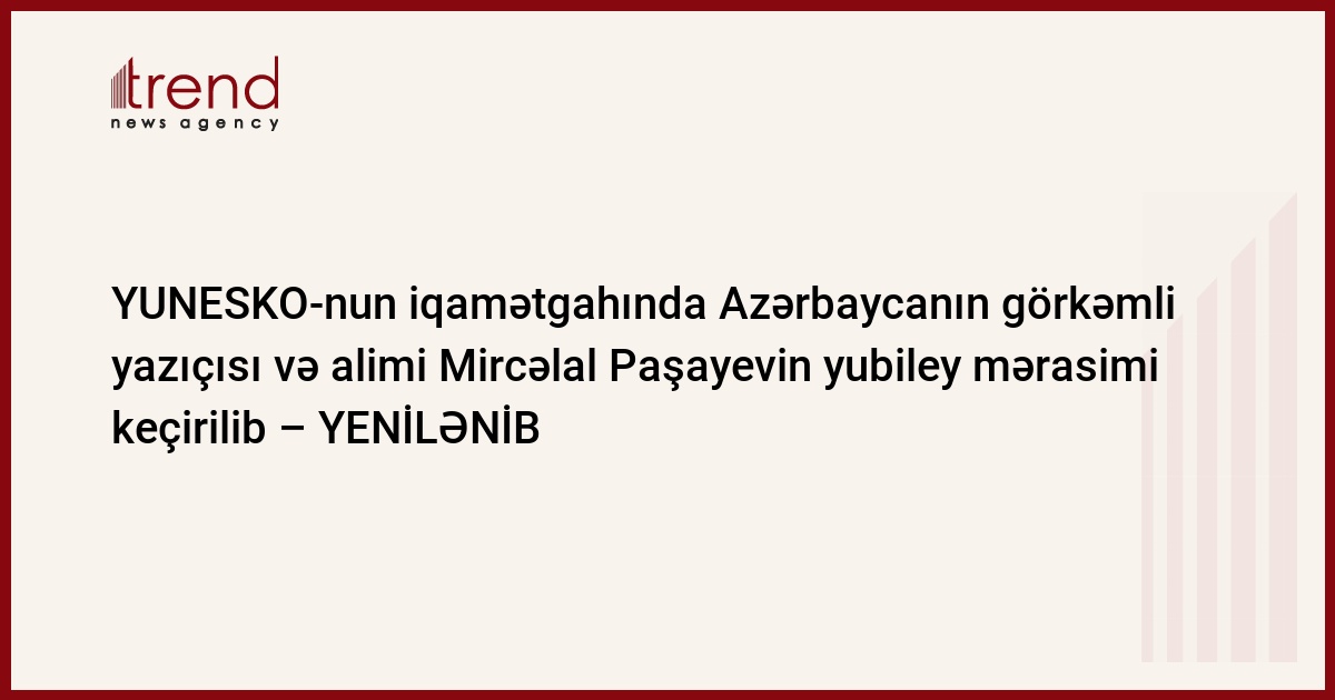 Fransa, Paris, 11 noyabr / Trend , müxbir A.Məhərrəmli/ YUNESKO-nun iqamətgahında, noyabrIn 10-da XX əsr Azərbaycan ədəbiyyatının görkəmli nümayəndəsi, alim və pedaqoq Mircəlal Paşayevin 100 illiyinə həsr olunmuş yubiley mərasimi keçirilib.