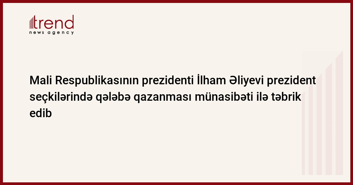 Mali Respublikasının prezidenti Amadu Tumani Ture Azərbaycan prezidenti İlham Əliyevi prezident seçkilərində qələbə qazanması münasibəti ilə təbrik edib.