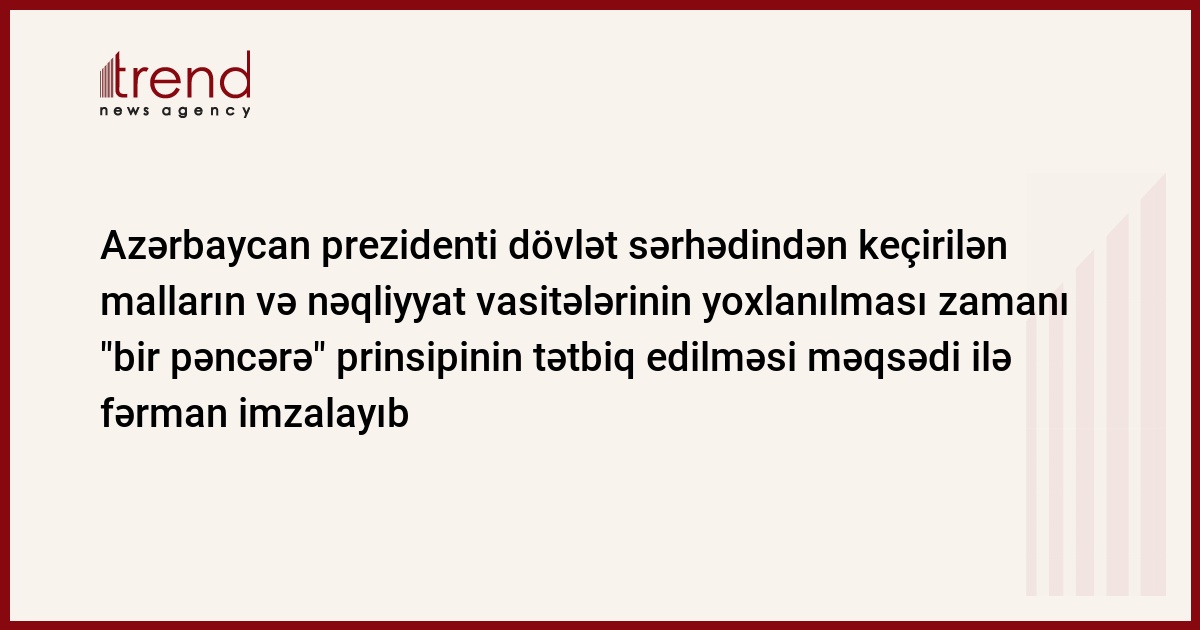 Azərbaycan prezidenti İlham Əliyev dövlət sərhədindən keçirilən malların və nəqliyyat vasitələrinin yoxlanılması zamanı süni maneələrin aradan qaldırılması, idxal-ixrac əməliyyatlarının müasir tələblərə uyğun aparılması üçün münbit şəraitin yaradılması, bu sahədə "bir pəncərə" prinsipinin tətbiq edilməsi məqsədi ilə fərman imzalayıb.