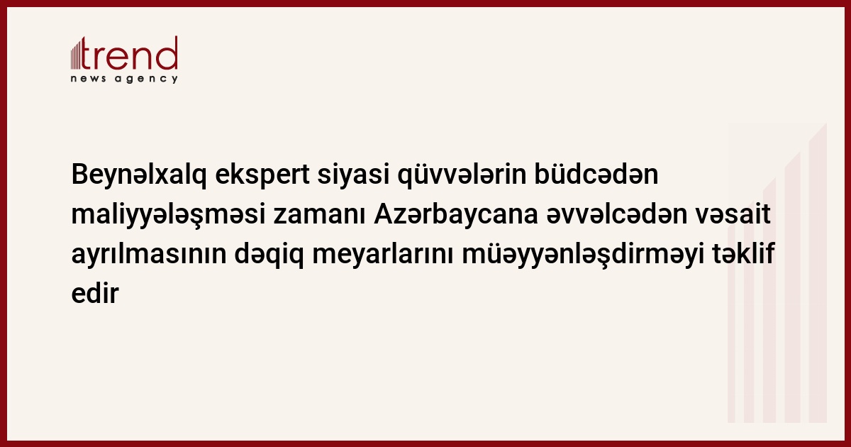Milli Məclisin İcra Aparatının rəhbəri Səfa Mirzəyev əvvəl Trend - a bildirib ki, bütün partiyalar dövlət büdcəsindən maliyyələşə bilməzlər. Onun sözlərinə görə, maliyyə dəstəyini yalnız Milli Məclisə seçkilərdə müəyyən uğur qazanan, yəni ölkə daxilində səslərin 4 -5 faizini toplayan partiyalar ala bilərlər.