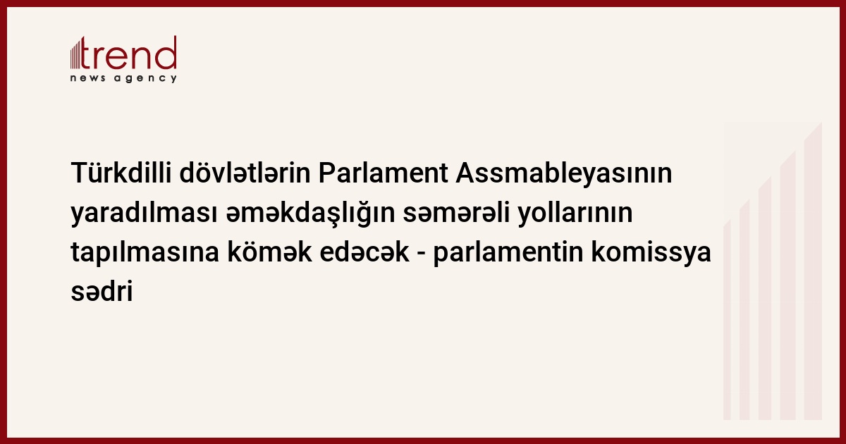 Azərbaycan, Bakı, 21 noyabr / Trend , müxbir İ.Əlizadə/ Türkdilli dövlətlərin Parlament Assemableyasının yaradılmasında əsas mənqsəd onlar arasında daha geniş iş birliyinin yaradılması, əməkdaşlığın perespektivləri və səmərəli yollarının tapılmasıdır. "Belə münasibətlərin qurulması kifayət qədər vacib məsələdir. Parlament Assambleyasında birgə qərarların qəbul olunması nəzərdə tutulub", - bu barədə cümə günü Türkdilli dövlətlərin Parlament Assmableyasının yaradılmasına dair saziş imzalandıqdan sonra Trend -a telefonla İstanbuldan Azərbaycan parlamentinin İnsan hüquqları daimi komissiyasının sədri Rəbiyyət Aslanova bildirib.