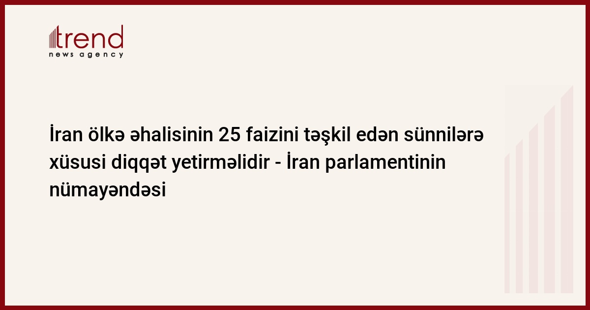 İran, Tehran, 10 dekabr / Trend , müxbir A.Namdari / İran parlamentinin nümayəndəsi bildirib ki, İran əhalisinin 25 faizini sünnilər təşkil edir və yerli rəsmilər öz qərarlarında ölkədəki dini azlıqların maraqlarını da nəzərə almalıdır.