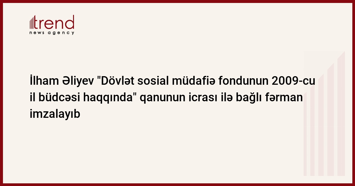 Azərbaycan prezidenti İlham Əliyev "Dövlət sosial müdafiə fondunun 2009-cu il büdcəsi haqqında" qanunun icrasının təmin edilməsi barədə fərman imzalayıb. Azərtac-ın yaydığı xəbərə görə, fərmana əsasən Nazirlər Kabinetinə tapşırılıb ki, əlillərin, ilk dəfə işaxtaranların və işsiz vətəndaşların sosial müdafiəsi ilə bağlı tədbirlərin maliyyələşdirilməsinin dövlət proqramlarını Naxçıvan Muxtar Respublikası üzrə xərclər ayrıca göstərilməklə bir ay müddətində təsdiq etsin;