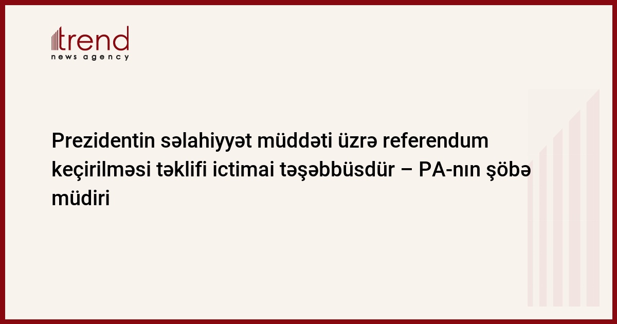 Azərbaycan, Bakı, 18 dekabr/ Trend , müxbir C.Babayeva/ Bir şəxsin iki dəfədən artıq ardıcıl prezident seçilməsinə tətbiq edilən məhdudiyyətin ləğvi məsələsi üzrə referendumun keçirilməsi təklifi ictimai təşəbbüsdür, - Azərbaycan Prezidenti İcra Aparatı ictimai-siyasi şöbəsinin rəhbəri Əli Həsənov cümə axşamı jurnalistlərə bildirib.
