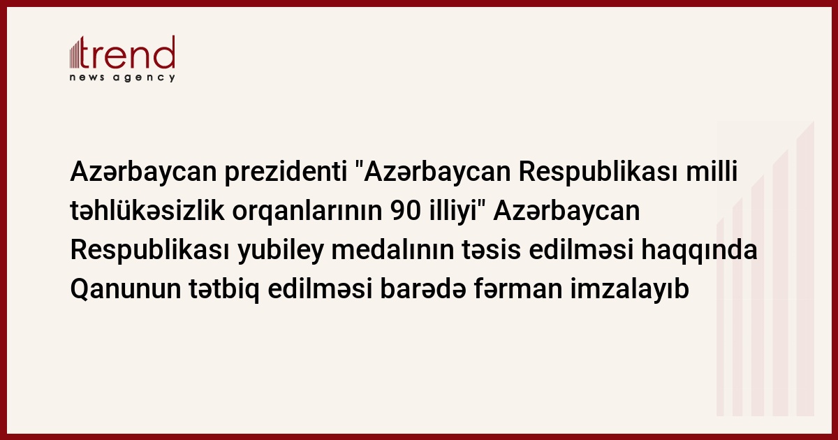 Azərbaycan prezidenti İlham Əliyev çərşənbə günü "Azərbaycan Respublikası milli təhlükəsizlik orqanlarının 90 illiyi" Azərbaycan Respublikası yubiley medalının təsis edilməsi haqqında Qanunun tətbiq edilməsi barədə fərman imzalayıb,- məlumatı AzərTAc dövlət informasiya agentliyi yayıb.