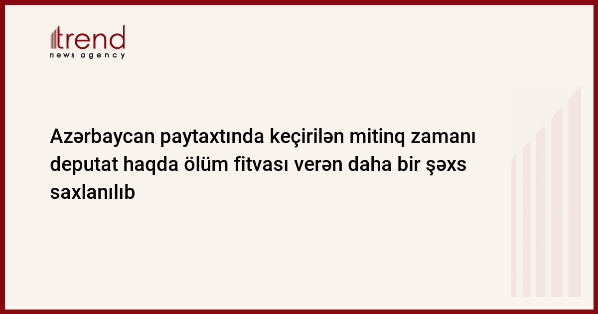 Azərbaycan, Bakı, 3 fevral / Trend , müxbir K. Zərbalıyeva/ Azərbaycan paytaxtının Nardaran qəsəbəsində keçirilən mitinq zamanı ölkə parlamentinin deputatı haqda ölüm fitvasının verilməsində təqsirli bilinən daha bir qəsəbə sakini saxlanılıb.
