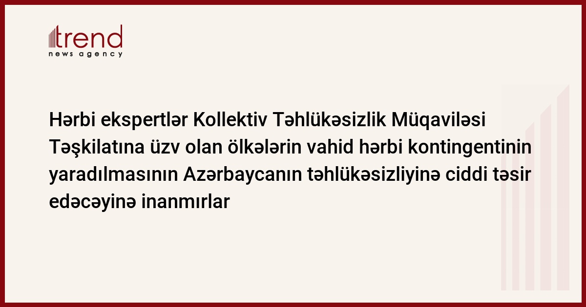 Azərbaycan, Bakı, 04 fevral / Trend , müxbir K.Zarbalıyeva, C.Babayeva/ Azərbaycanın hərbi ekspertləri Kollektiv Təhlükəsizlik Müqaviləsi Təşkilatına üzv olan ölkələrin vahid hərbi kontingentinin yaradılmasının Azərbaycanın təhlükəsizliyinə ciddi təsir edəcəyinə inanmırlar.