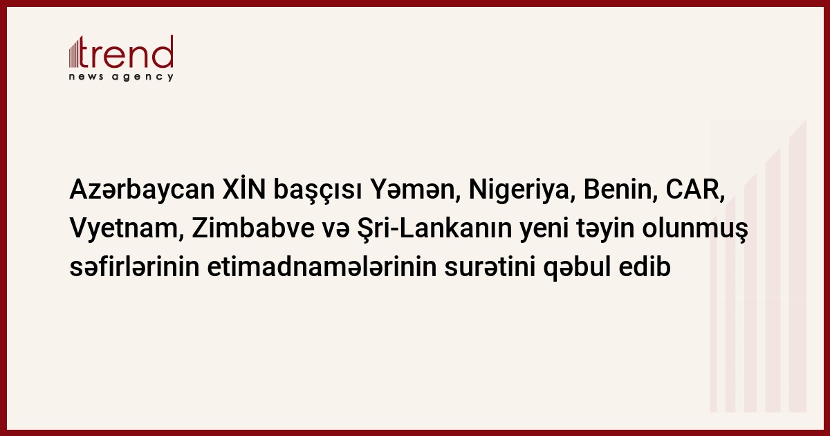 Azərbaycan, Bakı, 5 fevral / Trend / Xarici işlər naziri Elmar Məmmədyarov fevralın 5-də Yəmən, Nigeriya, Benin, Cənubi Afrika Respublikası, Vyetnam, Zimbabve və Şri-Lankanın eyni zamanda Azərbaycana yeni təyin olunmuş səfirlərinin etimadnamələrinin surətini qəbul edib.