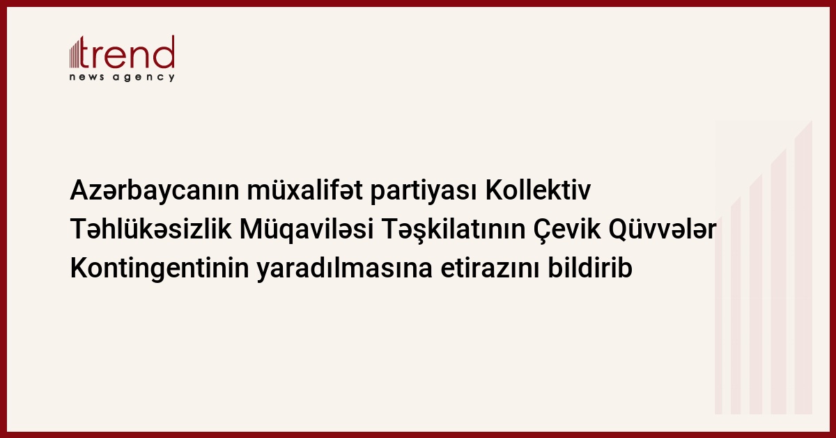 Azərbaycan, Bakı, 09 fevral / Trend , müxbir A.Hüseynbala/ Azərbaycanın müxalifət partiyası Kollektiv Təhlükəsizlik Müqaviləsi Təşkilatının (KTMT) Çevik Qüvvələr Kontingentinin yaradılmasına etirazını bildirib.