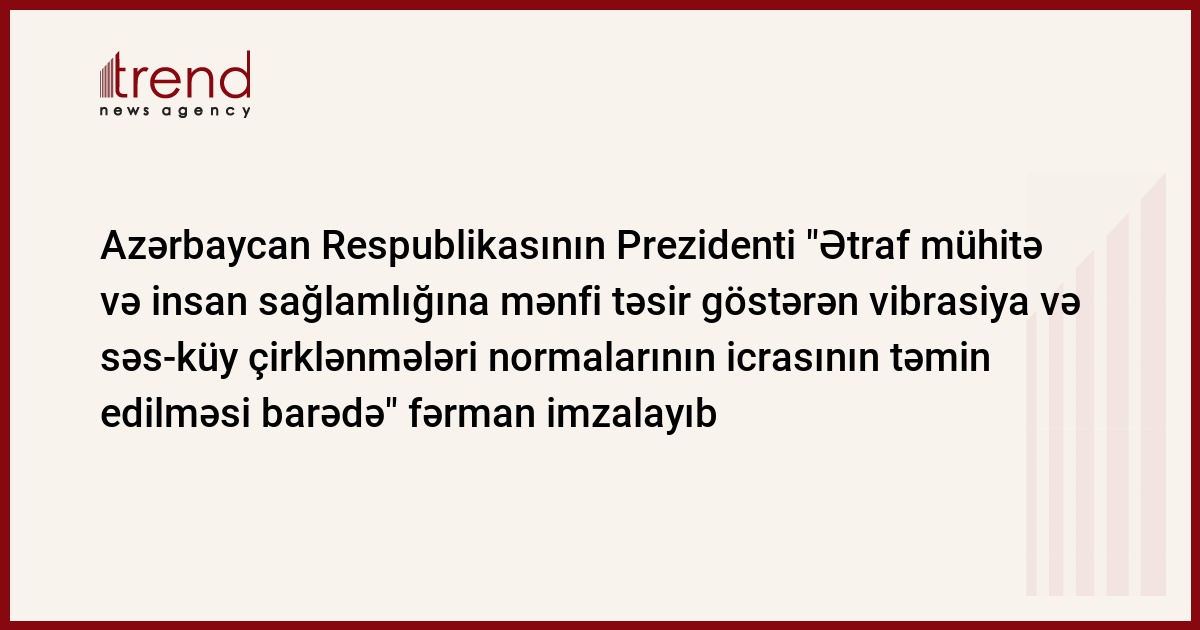 Azərbaycan, Bakı, 13 fevral / Trend / Azərbaycan Respublikasının Prezidenti "Ətraf mühitə və insan sağlamlığına mənfi təsir göstərən vibrasiya və səs-küy çirklənmələri normaları"nin icrasının təmin edilməsi barədə" fərman imzalayıb, - bu barədə AzərTAc informasiya agentliyi məlumat yayıb.