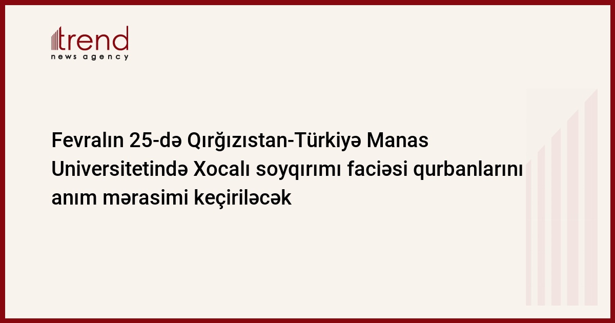 Qırğızıstan, Bişkek, 23 fevral / Trend , müxbir R.Мəşədihəsənli/ Fevralın 25-də Qırğızıstan-Türkiyə Manas Universitetində Xocalı soyqırımı faciəsi qurbanlarının anım mərasimi keçiriləcək. Bu barədə Trend müxbirinə bazar ertəsi təşkilat komitəsinin sədri və universitetin tələbəsi Rasim Şirinov məlumat verib.