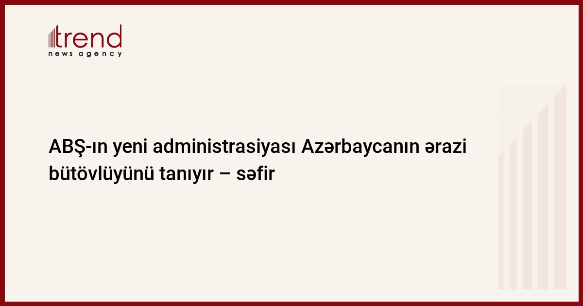 Azərbaycan, Bakı, 04 mart / Trend , müxbir E.Rüstəmov / ABŞ-ın yeni administrasiyası Azərbaycanın ərazi bütövlüyünü tanıyır. Bu barədə çərşənbə günü ABŞ-ın Azərbaycandakı səfiri Enn Dersi bildirib.
