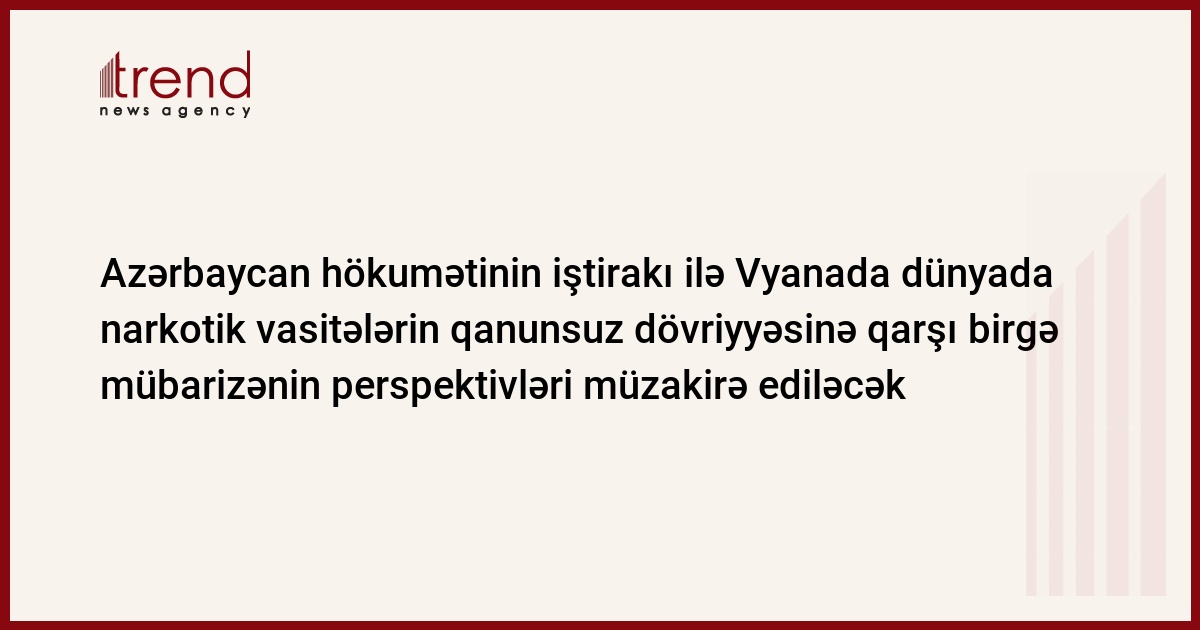 Dünyada narkotik vasitələrin qanunsuz dövriyyəsinə qarşı birgə mübarizənin perspektivləri Vyanada müzakirə ediləcək. Martın 11-dən 20-dək Vyana Beynəlxalq Mərkəzində keçiriləcək BMT Narkotik Vasitələr Komissiyasının 52-ci illik sessiyasında Azərbaycan hökumətinin nümayəndə heyəti də iştirak edəcək, - bazar ertəsi Trend -a Daxili İşlər Nazirliyinin Mətbuat Xidmətindən məlumat verilib.
