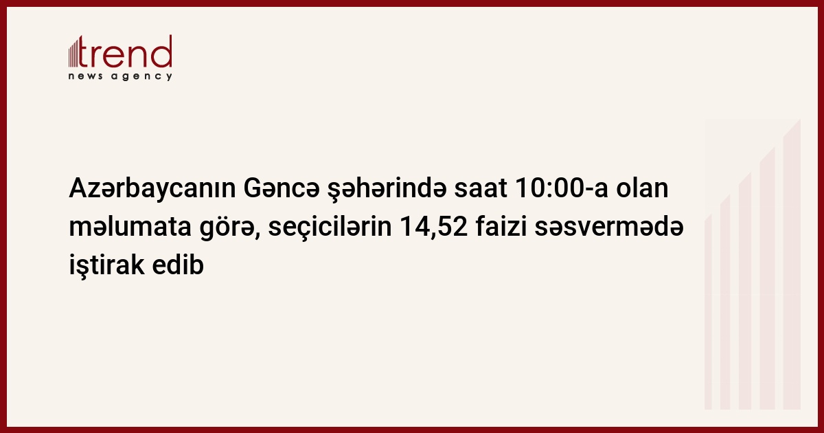 Saat 10:00 olan məlumata görə, Azərbaycanın qərbində yerləşən Gəncədə (paytaxt Bakıdan 365 kilometr məsafədə) olan seçicilərin 14,52 faizi seçkilərdə iştirak edib. Bu barədə Trend -a Gəncədə olan Dairə Seçki Komissiyalarından məlumat veriblər.