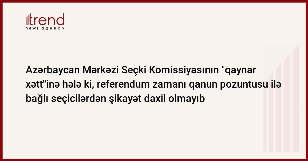 Azərbaycan Mərkəzi Seçki Komissiyasının "qaynar xətt"inə referendum üzrə səsvermə zamanı hər hansı bir qanun pozuntusuna dair seçicilərdən şikayət daxil olmayıb. Bu barədə çərşənbə günü jurnalistlərə Azərbaycan Mərkəzi Seçki Komissiyası nəzdindəki "Seçkilər" İnformasiya Mərkəzinin direktoru Ramil Hüseynli məlumat verib.