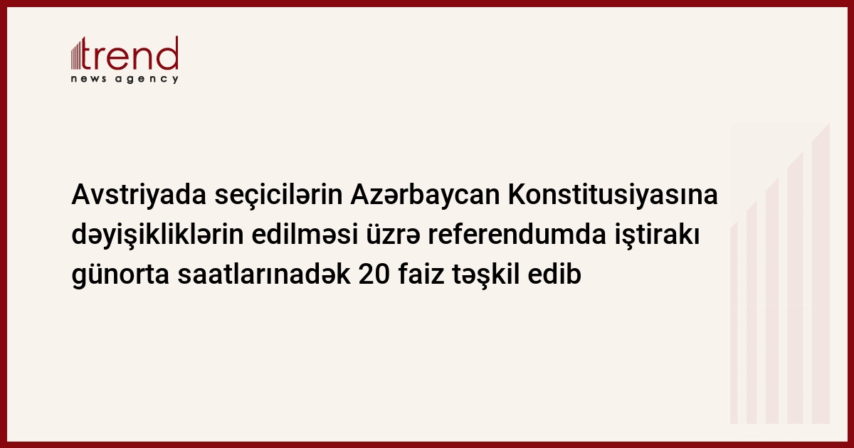 115 nəfər seçicinin qeydiyyata alındığı Azərbaycanın Avstriyadakı səfirliyində yerli vaxtla günortayadək seçicilərin 23 nəfəri səs verib. (20%). Bu barədə Trend -a Azərbaycanın Vyanadakı diplomatik nümayəndəliyindən məlumat verilib.