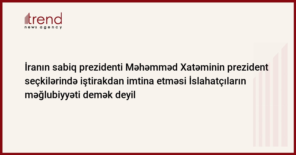 İranın sabiq prezidenti, İslahatçılardan olan namizəd Məhəmməd Xatəmi martın 16-dan 17-nə keçən gecə rəsmi şəkildə bəyanat yayaraq iyunda ölkədə keçiriləcək prezident seçkilərində iştirak etməyəcəyini bildirib.