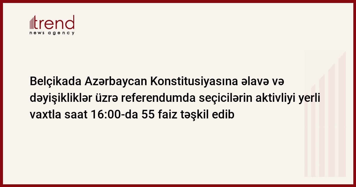 Azərbaycanın Belçika və Lüksemburqdakı səfirliyində Azərbaycan Konstitusiyasına əlavə və dəyişikliklər üzrə referendumda seçicilərin aktivliyi yerli vaxtla saat 16:00-da 55 faiz təşkil edib.