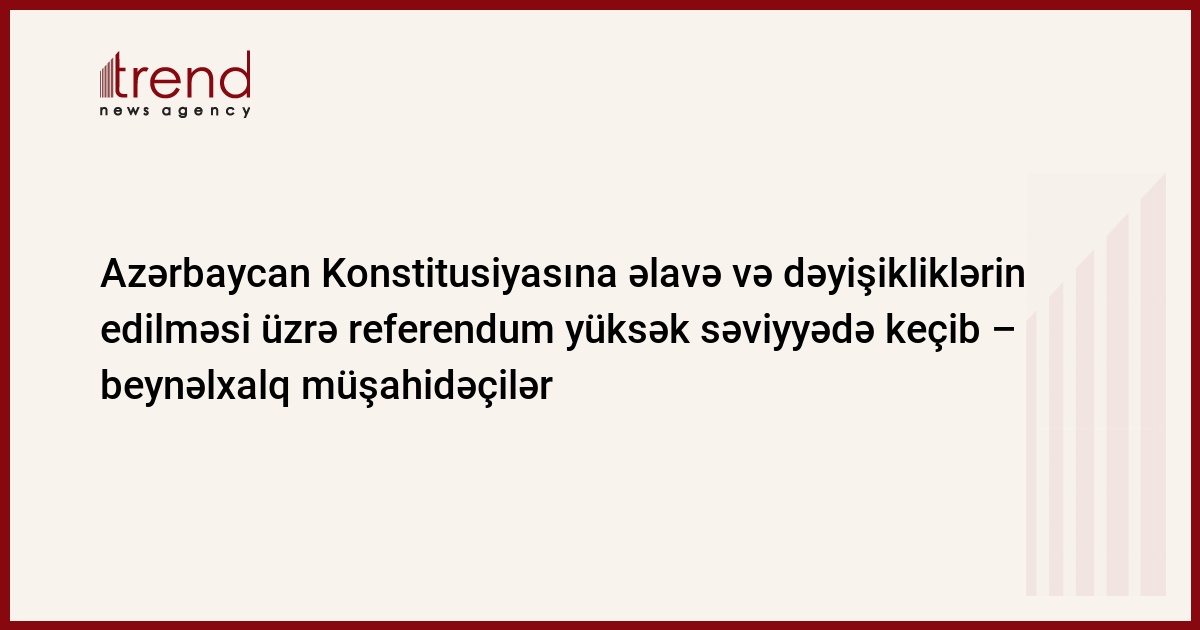 Beynəlxalq müşahidəçilər Azərbaycan Konstitusiyasına əlavə və dəyişikliklərin edilməsi üzrə referendumun mütəşəkkil, şəffaf və demokratik keçdiyini qeyd edirlər.