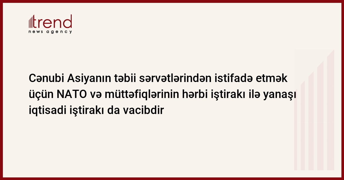 Azərbacan, Bakı, 4 aprel / Trend , müxbir D.İbrahimova / Cənubi Asiyada vəziyyətin sabitləşməsi və təbii resurslarıdan tam olaraq istifadə etmək üçün NATO və müttəfiqlərinin hərbi iştirakı ilə yanaşı iqtisadi iştirakı da vacibdir.