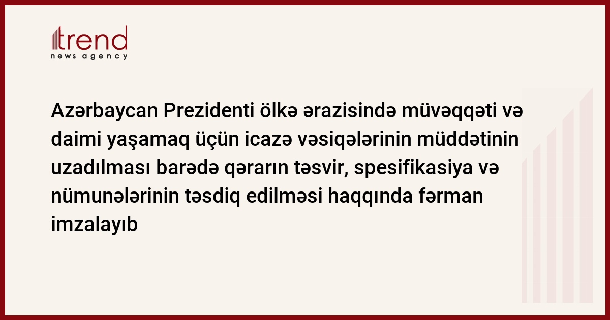 Azərbaycan Prezidenti İlham Əliyev ölkə ərazisində müvəqqəti və daimi yaşamaq üçün icazə vəsiqələrinin, habelə əcnəbilərin və vətəndaşlığı olmayan şəxslərin ölkədə müvəqqəti olma müddətinin uzadılması barədə qərarın təsvir, spesifikasiya və nümunələrinin təsdiq edilməsi haqqinda fərman imzalayıb. Məlumatı AzərTAc Dövlət İnformasiya Agentliyi yayıb.