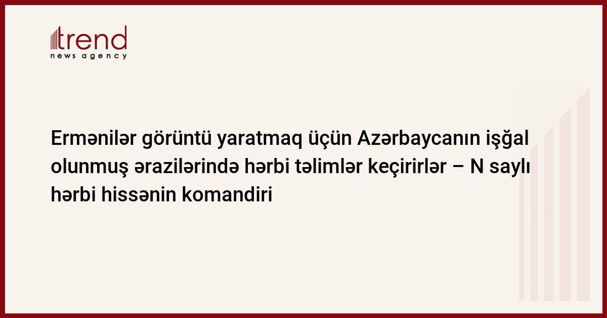 Ermənistan Silahlı Qüvvələri görüntü yaratmaq üçün Azərbaycanın işğal olunmuş ərazilərində hərbi təlimlər keçirirlər. Trend -un məlumatına görə, nu barədə cümə axşamı jurnalistlərə Ağdam rayonunda, qoşunların təmas xəttində yerləşən N saylı hərbi hissənin komandiri Nizam Osmanov bildirib.