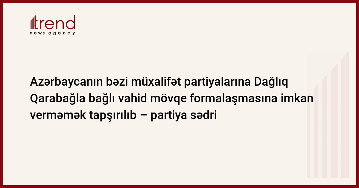 Trend -un arayışı: DUİ Dağlıq Qarabağ münaqişəsinin nizamlanması ilə bağlı yaranan indiki situasiyanın müzakirəsi üçün mayın 14-də "Qarabağ Forumu" keçirmək niyyətindədir. DUİ-də Klassik Xalq Cəbhəsi, Milli-Demokrat, Azadlıq, Böyük Azərbaycan, Xalq partiyaları təmsil olunur.