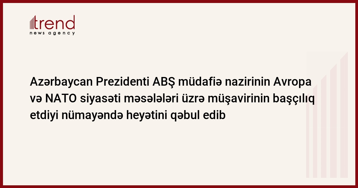 Azərbaycan Prezidenti İlham Əliyev çərşənbə axşamı ABŞ müdafiə nazirinin Avropa və NATO siyasəti məsələləri üzrə müşaviri xanım Meri Varlikin başçılıq etdiyi nümayəndə heyətini qəbul edib, məlumatı AzərTAc Dövlət İnformasiya Agentliyi yayıb.