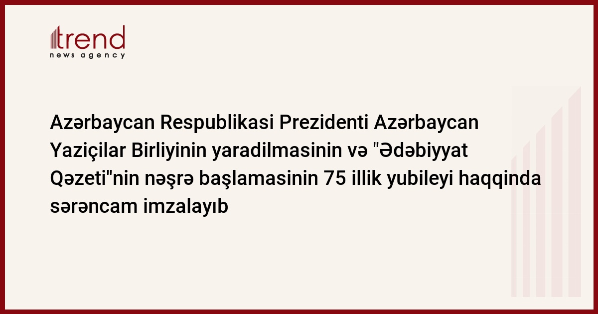 2009-cu ildə Azərbaycan Yazıçılar Birliyinin yaradılmasının və bu təşkilatın ədəbi orqanı "Ədəbiyyat qəzeti"nin nəşrə başlamasının 75 illiyi tamam olur. Azərbaycan Yazıçılar Birliyi fəaliyyətə başladığı vaxtdan etibarən müxtəlif sınaqlardan keçərək milli ədəbiyyatın, ana dilinin qorunub yaşadılmasında böyük xidmətlərini, azərbaijan xalqının mədəniyyəti tarixini və mənəvi sərvətlər xəzinəsini bədii-estetik düşüncənin bir çox qiymətli nümunələri ilə zənginləşdirmək işini nəzərə alaraq, Azərbaycan Respublikası Prezidenti İlham Əliyev Azərbaycan Yazıçılar Birliyinin yaradılmasının və "Ədəbiyyat qəzeti"nin nəşrə başlamasının 75 illik yubileyinin ölkə miqyasında qeyd olunmasını haqqında sərəncam imzalayıb. Məlumatı AzərTAc Dövlət İnformasiya Agentliyi yayıb.