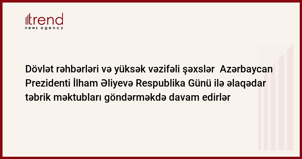 Dövlət rəhbərləri və yüksək vəzifəli şəxslər Azərbaycan Prezidenti İlham Əliyevə Respublika Günü ilə əlaqədar təbrik məktubları göndərməkdə davam edirlər.