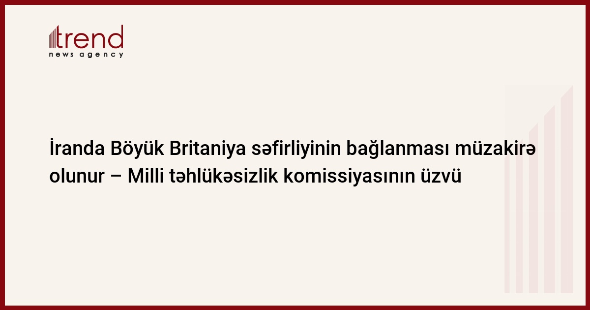Böyük Britaniya səfini ölkədən çıxarmaq və bu ölkə ilə münasibətləri yenidən nəzərdən keçirmək İran Parlamentinin Milli təhlükəsizlik və xarici siyasət üzrə komissiyasında müzakirə olunub. Bu barədə komissiyanın üzvü və mətbuat katibi Kazım Cəlali Trend -a bildirib.