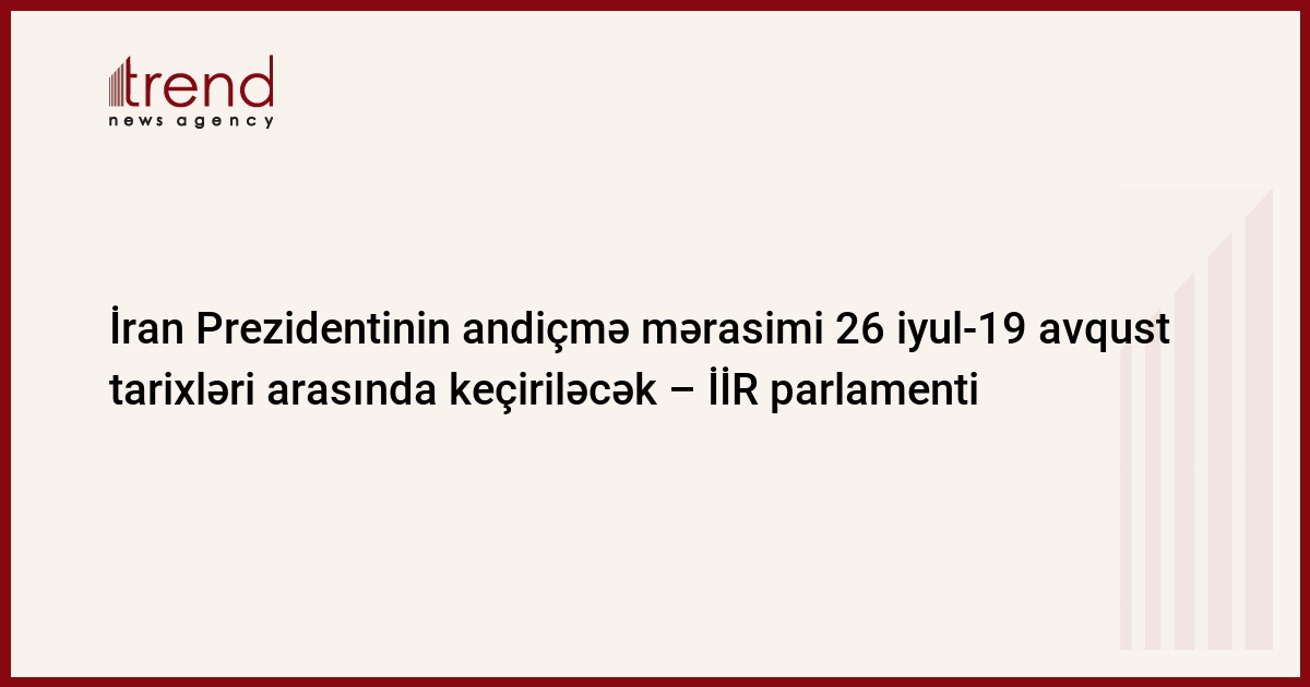 İran parlamenti bəyan edib ki, yenidən İranın preizdenti seçilmiş Mahmud Əhmədinejadın andiçmə mərasimi və yeni Nazirlər Kabinetinin təsdiqlənməsi 26 iyul-19 avqust tarixləri arasında keçiriləcək. Bu barədə MEHR agentliyi bildirib.