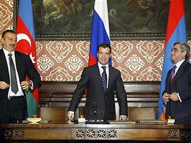Rusiya, Azərbaycan və Ermənistan prezidentləri Dmitri Medvedyev, İlham Əliyev və Serj Sarksyan şənbə günü Moskvada keçirilən görüşdə Dağlıq Qarabağ münaqişəsinin nizamlanmasının gələcək yollarını müzakirə edirlər, RİA Novosti xəbər verib.