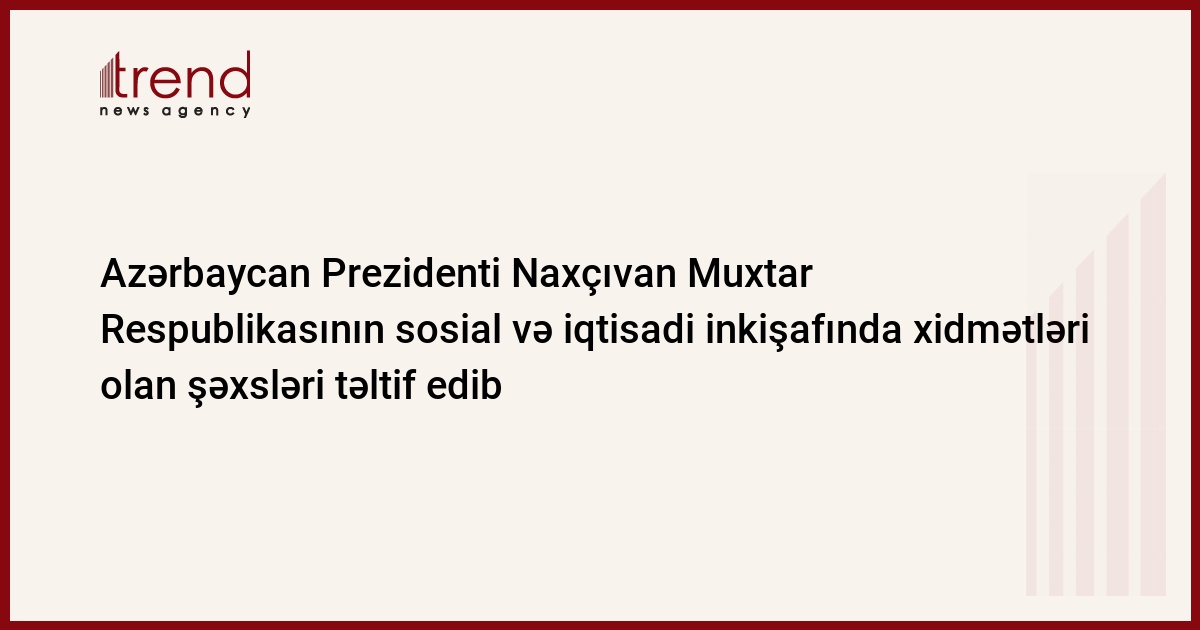 Azərbaycan Prezidenti İlham Əliyev bazar ertəsi Naxçıvan Muxtar Respublikasının sosial və iqtisadi inkişafında böyük xidmətləri olan şəxslərin təltif edilməsi haqqında sərəncam imzalayıb. Məlumatı AzərTAc Dövlət İnformasiya Agentliyi yayıb.
