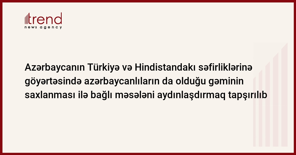 Azərbaycanın Türkiyə və Hindistandakı səfirliklərinə göyərtəsində beş Azərbaycan vətəndaşının da olduğu türk gəmisinin Hindistan sahillərində saxlanması ilə bağlı məsələni aydınlaşdırmaq tapşırılıb. Bu barədə cümə axşamı Trend -a Azərbaycan XİN-in mətbuat xidmətindən bildirilib.