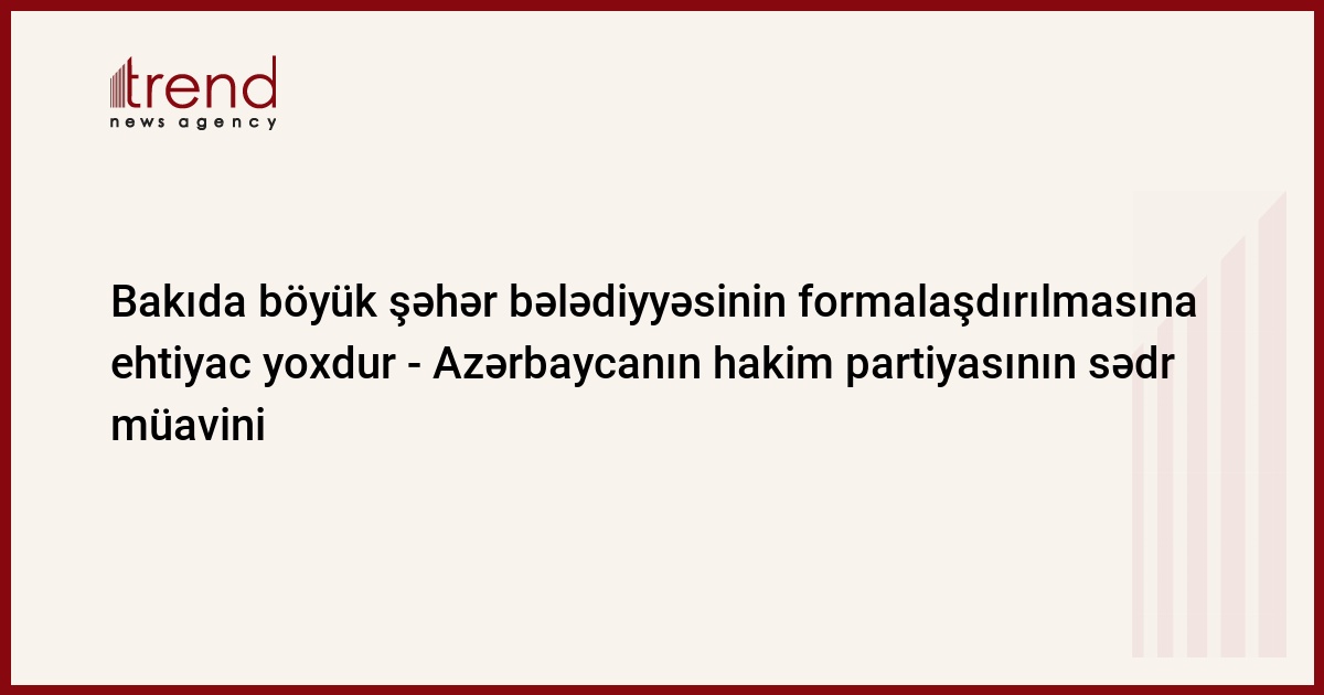 Azərbaycanın hakim partiyasının sədr müavini, icra katibi paytaxtda böyük şəhər bələdiyyəsinin formalaşdırılmasına çox böyük ehtiyac olduğunu düşünmür.