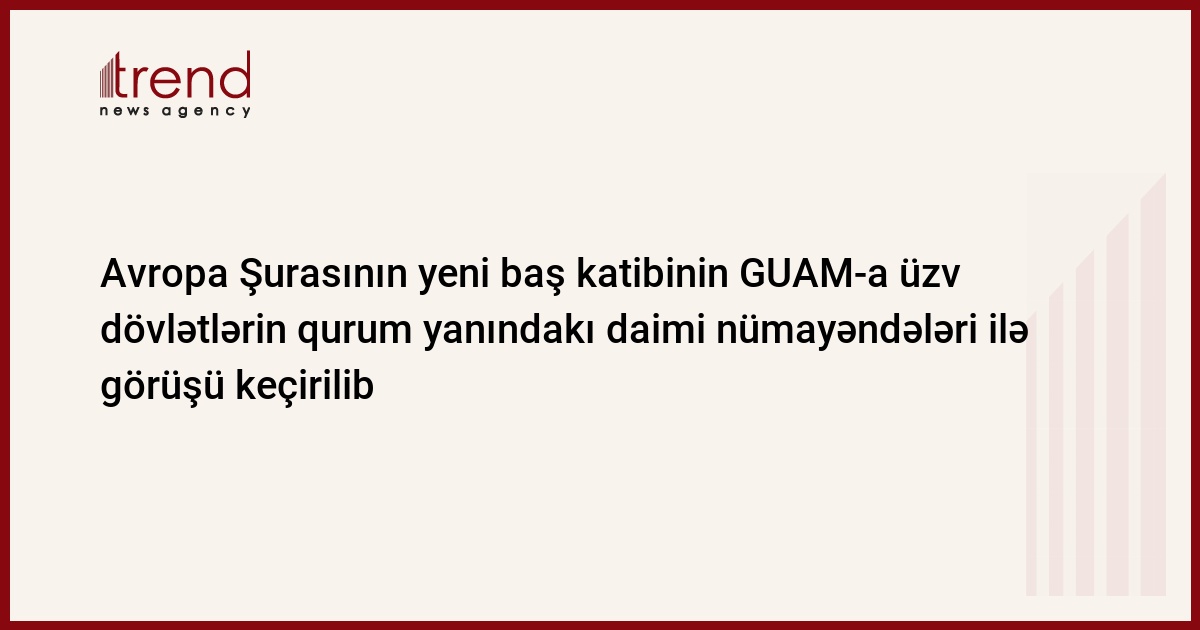 Avropa Şurasının yeni seçilmiş baş katibi Torbyorn Yaqlandın GUAM-a üzv dövlətlərin qurum yanındakı daimi nümayəndələri ilə görüşü keçirilib. Bu barədə Trend -a çərşənbə günü Azərbaycanın AŞ yanındakı Daimi Nümayəndəliyindən məlumat verilib.